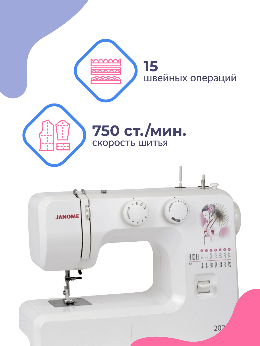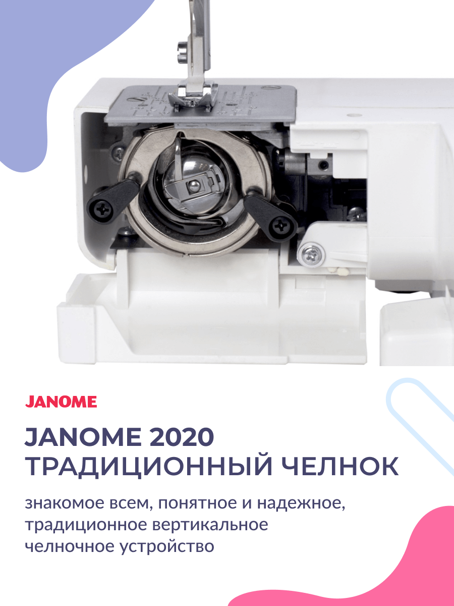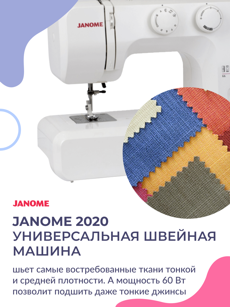 Janome 2020 - проста в обращении и надежная в управлении. Швейная машина выполняет 15 операций. Петля в полуавтоматическом режиме. Машина для всех видов тканей.