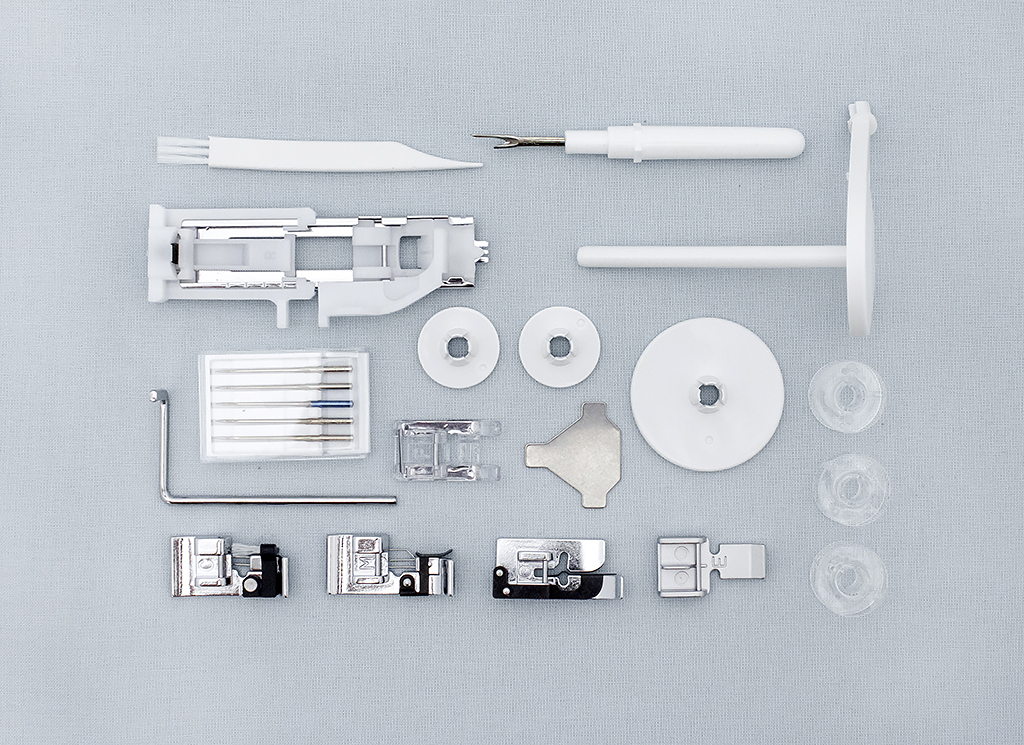 В комплекте Жесткий чехол Лапка стандартная Лапка оверлочная с щеточкой Лапка оверлочная Лапка для невидимой подгибки Лапка для вшивания молнии Лапка прозрачная для атласных строчек Лапка для выметывания петли Распарыватель Направитель для стежки Набор игл Шпульки Щеточка Катушечный стержень Держатель катушки большой Держатель катушки малый Отвертка